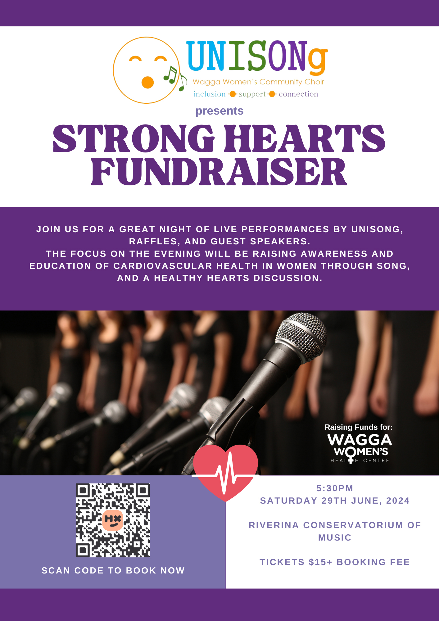 The Strong Hearts Fundraiser is presented by UNISONg,Wagga Women's Community Choir and will be a fundraising event for the Wagga Womens Health Centre. Group singing has been shown to improve our health in so many ways.and the evening aims to put a spotlight on cardiovascular health in women through song and a healthy hearts discussion.